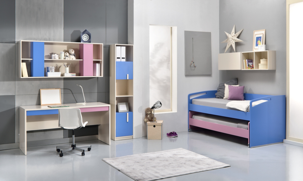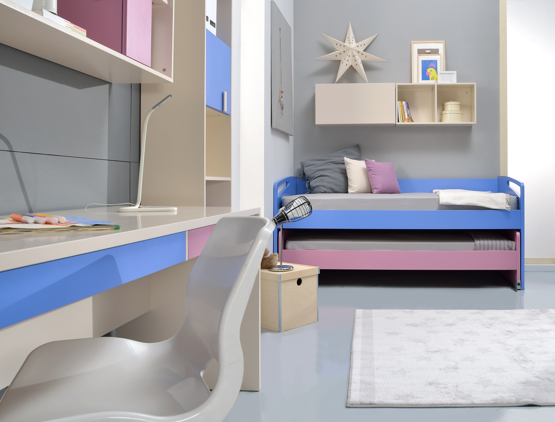 Παιδικό δωμάτιο με υπερυψωμένο κρεβάτι Flexy και δεύτερο τροχήλατο κρεβάτι.