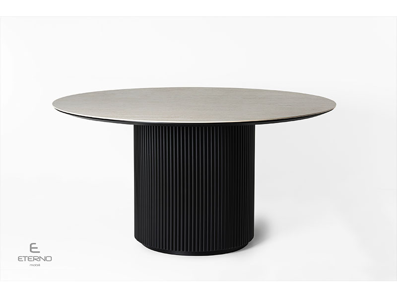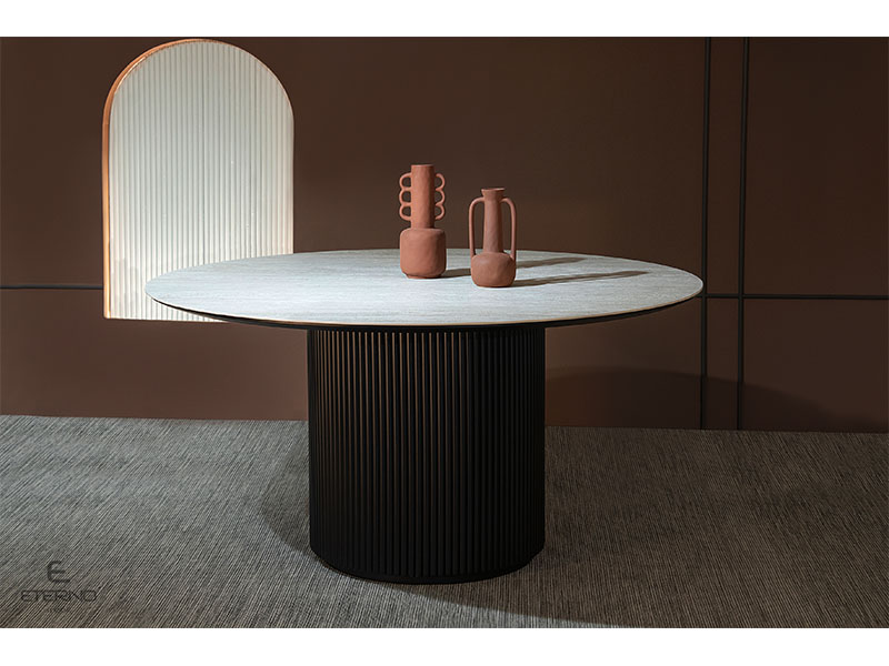 Η τραπεζαρία “icon” αποτυπώνει μια αρμονική συνύπαρξη κεραμικής επιφάνειας και γραμμωτών ξύλινων κυλινδρικών βάσεων, προσφέροντας μια ατμόσφαιρα απόλυτης κομψότητας.
