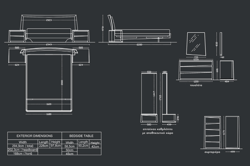 Κρεβάτι (στρώμα 1,60*2,00): 1,68*2,28*0,98