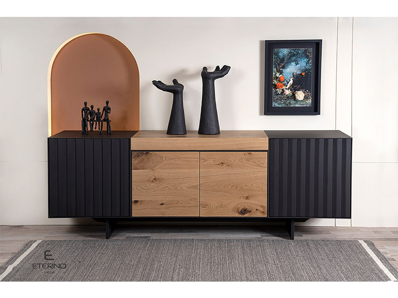 O μπουφές DESIRE κατασκευάζεται από ξύλο δρυς ρουστίκ σε συνδυασμό με λάκα γκοφρέ. Δυνατότητα επιλογής σε αποχρώσεις του ξύλου . Διάσταση 210x47x75